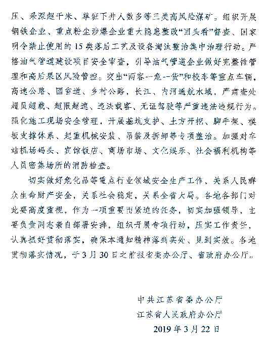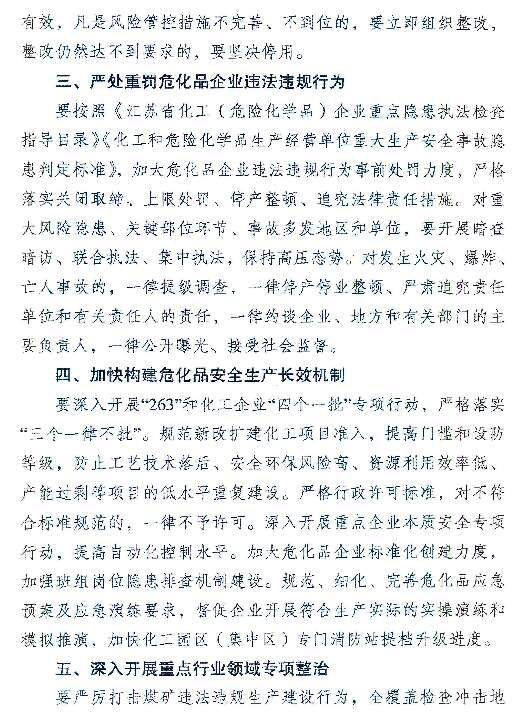 江蘇省發(fā)布《關(guān)于切實(shí)做好危化品等重點(diǎn)行業(yè)領(lǐng)域安全生產(chǎn)的緊急通知》,要深入開展“263”和化工企業(yè)“四個一批”專項(xiàng)行動,嚴(yán)格落實(shí)“三個一律不批”。規(guī)范新改擴(kuò)建化工項(xiàng)目準(zhǔn)入,提高門檻和設(shè)防等級,防止工藝技術(shù)落后、安全環(huán)保風(fēng)險(xiǎn)高、資源利用效率低、產(chǎn)能過剩等項(xiàng)目的低水平重復(fù)建設(shè)。嚴(yán)格行政許可標(biāo)準(zhǔn),對不符合標(biāo)準(zhǔn)規(guī)范的,一律不予許可。深入開展重點(diǎn)企業(yè)本質(zhì)安全專項(xiàng)行動,提高自動化控制水平。
