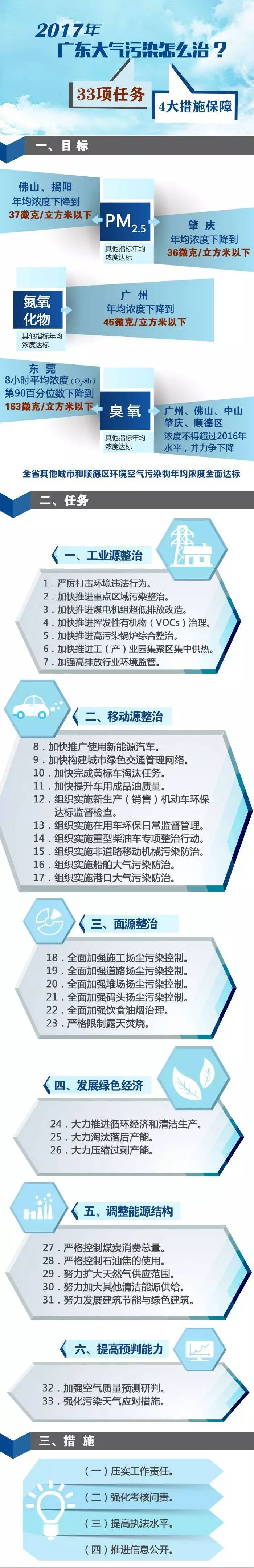 2017年廣東大氣污染治理工作如何開展,33項(xiàng)任務(wù)、四大保障措施全面攻克PM2.5、臭氧和氮氧化物。