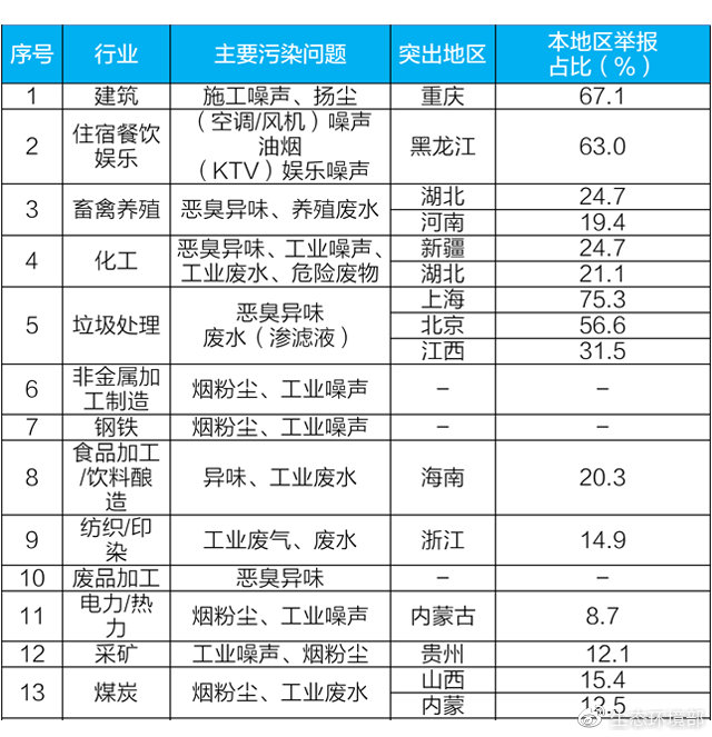 受產(chǎn)業(yè)結(jié)構(gòu)、管理水平等方面影響,各地主要舉報行業(yè)差異較大。其中,重慶建筑業(yè)、黑龍江住宿餐飲娛樂業(yè)、上海和北京垃圾處理業(yè)舉報占本省(市)舉報量的一半以上,超過全國平均值一倍。湖北畜禽養(yǎng)殖業(yè)、新疆化工業(yè)、海南食品加工/飲料釀造業(yè)舉報超過全國平均值約15個百分點。此外,浙江紡織印染業(yè)、貴州采礦業(yè)、山西和內(nèi)蒙古煤炭業(yè)舉報也相對突出。