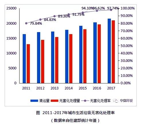 《生活垃圾處理行業(yè)2018年度發(fā)展報告》介紹,隨著我國城鎮(zhèn)化進程的推進,城市生活垃圾清運量逐年增長,2016年生活垃圾清運量已經(jīng)達到2.70億噸,其中城市生活垃圾清運量2.03億噸。縣城生活垃圾清運量0.67億噸,并在以每年4%-5%的增速逐年攀升。根據(jù)2018年中國統(tǒng)計年鑒,2017年城市生活垃圾清運量達2.15億噸。