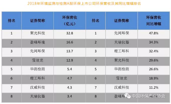 成長表現:2018年,8家環(huán)境監(jiān)測與檢測A股環(huán)保上市公司(港股無該領域環(huán)保上市公司)共實現營收257.4億元,同比增長71.4%,8家營收均同比增長,最高增幅約達166.3%;環(huán)保營收93.7億元,同比增長22.0%,其中7家(占比87.5%)同比增長,最高增幅約達47.8%,1家(占比12.5%)同比下滑,跌幅約達-4.0%。從收入看,2018年環(huán)境監(jiān)測與檢測A股環(huán)保上市公司總體成長表現優(yōu)于2017年。