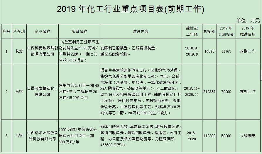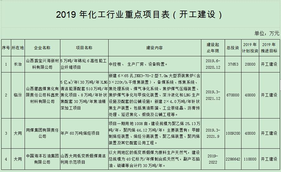 近日,山西省公布了化工行業(yè)2019年行動(dòng)計(jì)劃,同時(shí)公布了今年化工行業(yè)重點(diǎn)項(xiàng)目表。