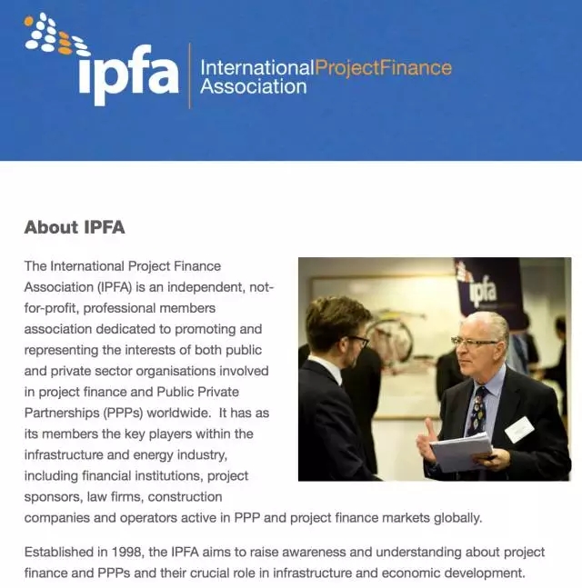 國際項目融資協(xié)會(IPFA)是于 1998 年 11 月在倫敦成立的非盈利性國際機(jī)構(gòu),在全球有超過600家的機(jī)構(gòu)會員,是全球最大的聚焦項目融資和PPP的專業(yè)網(wǎng)絡(luò)和交流平臺。其會員多是基礎(chǔ)設(shè)施建設(shè)和能源行業(yè)的主要參與者,包括金融機(jī)構(gòu)、項目發(fā)起人、律師事務(wù)所、建筑公司以及從事PPP項目的運營商。