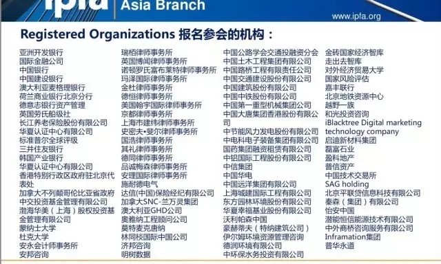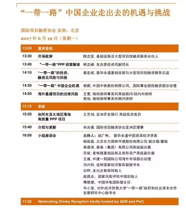 由IPFA的兩個會員機(jī)構(gòu)亞洲開發(fā)銀行和普華永道PwC聯(lián)合舉辦,邀請來自國家發(fā)展改革委、國際金融機(jī)構(gòu)、咨詢公司、律師事務(wù)所、智庫和中國企業(yè)等嘉賓,共同討論快速發(fā)展的國內(nèi)PPP市場和激增的走出去需求所帶來的機(jī)遇和挑戰(zhàn),并向中國公司提供政策解讀和專業(yè)建議。參加活動的發(fā)言嘉賓,個個堪稱重量級,如發(fā)改委投資司副司長韓志鋒,亞行高級投資官員王藝鴻,普華永道基礎(chǔ)設(shè)施與大型項目投融資服務(wù)總監(jiān)姜宏斌,中國中鐵股份公司國際事業(yè)部投融資部總經(jīng)理楊鵬等等。