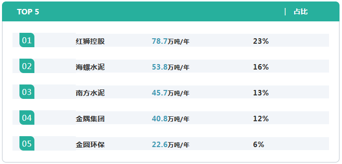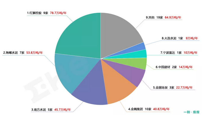 在水泥窯協(xié)同處置危廢上處置能力排名前五的集團為紅獅、海螺、南方水泥、金隅和金圓,合計危廢處置能力占行業(yè)總量的70%。除此之外,華新、中建材、臺泥等也在推進水泥窯協(xié)同項目的發(fā)展,并在積極的往危廢處置方向進行改造和擴張。部分環(huán)保企業(yè)也敏感的注意到水泥窯協(xié)同處置危廢的優(yōu)勢及發(fā)展?jié)摿?,積極布局,占有不小的比重。