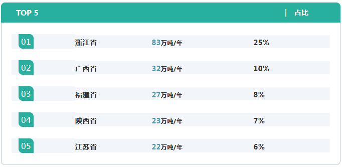 截至2019年4月30日我國已有20個省份(或直轄市)存在水泥窯協(xié)同處置危險廢物的產能,規(guī)模前五名的省份為浙江、廣西、福建、陜西和江蘇,合計規(guī)模占全國總量56%。