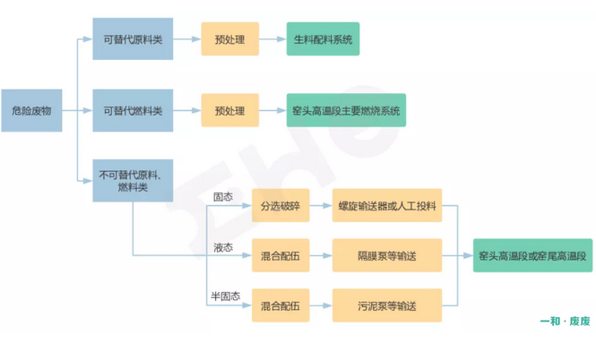 危廢進入水泥窯之前需進行預處理,一般根據(jù)危廢性質進行分類處理: