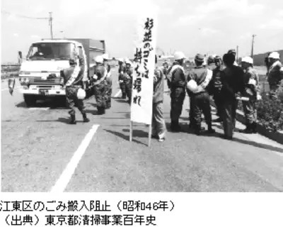 另一方面,江東區(qū)政府和區(qū)民也慢慢意識到,都政府關(guān)于垃圾填埋到1970年為止的承諾,根本沒有實現(xiàn)的可能性。到了1971年,平均每天有5000輛以上的搬運車,將東京中心23區(qū)所生產(chǎn)的垃圾中的70%搬運到江東區(qū)進行填埋。由此產(chǎn)生的交通堵塞、蚊蟲叢生、空氣污染甚至是火災,給江東區(qū)區(qū)民的日常生活造成重大困擾。