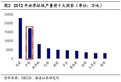 我國城鎮(zhèn)垃圾產(chǎn)量巨大。根據(jù)國家統(tǒng)計局數(shù)據(jù),2000年我國的常住人口城鎮(zhèn)化率僅為36.22%,到2015年末為56.1%,年均增加1.33個百分點,城鎮(zhèn)人口的不斷增加使得城鎮(zhèn)生活垃圾產(chǎn)生量與日俱增。根據(jù)OECD數(shù)據(jù),2012年我國垃圾清運量僅次于美國,高居世界第二位,且遙遙領(lǐng)先于后面的俄羅斯、巴西、德國等國家。根據(jù)國家統(tǒng)計局數(shù)據(jù),2001年我國垃圾清運量為1.35億噸,2015年為1.91億噸,CAGR為3.27%。