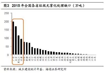 城鎮(zhèn)垃圾無害化處理缺口巨大。以人均垃圾產(chǎn)生量1.2kg/日來計算,2015年我國城鎮(zhèn)垃圾生產(chǎn)總量為3.38億噸,而2015年我國垃圾清運量為1.91億噸,對應(yīng)缺口巨大。另一方面,從清運量看,2015年我國生活垃圾無害化處理量為1.8億噸,無害化處理率為94.1%,對應(yīng)全國無害化處理總?cè)笨跒?129萬噸,分省區(qū)來看,缺口最大的有廣東(196萬噸)、北京(168萬噸)、黑龍江(114萬噸)、甘肅(94萬噸)。2006-2015年間,我國生活垃圾無害化處理缺口累計超過3.6億噸。