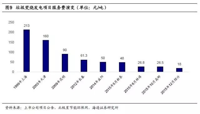 行業(yè)競爭加劇,處理費下行。在市場參與者逐漸增多和行業(yè)競爭逐步加劇的背景下,近年新建的垃圾焚燒項目處理費呈下降趨勢。2015年以來,一些企業(yè)為了搶占市場而壓低價格,低價中標項目涌現(xiàn):2015年山東新泰項目中標價48元/噸,安徽蚌埠項目中標價26.8元/噸,江蘇高郵項目中標價26.5元/噸,浙江紹興項目中標價更是降至18元,擾亂市場正常秩序。除去少數(shù)惡意壓低價格的項目,根據(jù)中國經(jīng)濟導(dǎo)報統(tǒng)計,近年來垃圾焚燒特許經(jīng)營項目處理費每噸平均在60~80元,整體呈現(xiàn)小幅下降的趨勢。