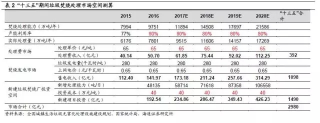 按照垃圾焚燒規(guī)劃新增處理能力對市場空間進行測算,“十三五”期間垃圾焚燒處理費市場空間總計近400億元,焚燒發(fā)電市場空間約1100億元,兩者合計運營收入約1500億元;此外,新增處理能力所需的建設(shè)投資總計近1500億元,垃圾焚燒市場空間巨大。