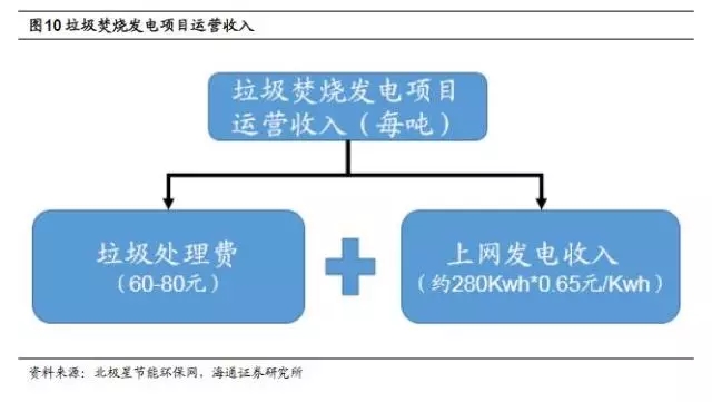 BOT模式下,垃圾焚燒項目的收入主要來自建設(shè)階段的工程收入和運營階段的運營收入。垃圾焚燒發(fā)電項目運營階段收入主要為垃圾處理費(政府補貼)以及上網(wǎng)發(fā)電收入。不同項目的垃圾處理費價格差異較大,大致在50-150元/噸的區(qū)間里,目前大部分項目的平均水平在60-80元/噸。根據(jù)2012年4月發(fā)布的《國家發(fā)展改革委關(guān)于完善垃圾焚燒發(fā)電價格政策的通知》,每噸生活垃圾折算上網(wǎng)電量為280千瓦時,執(zhí)行全國統(tǒng)一垃圾發(fā)電標桿電價每千瓦時0.65元(含稅,增值稅即征即退);超過部分電量執(zhí)行當?shù)赝惾济喊l(fā)電機組上網(wǎng)電價。