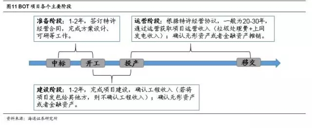 對項目公司而言,項目中標后,主要會經(jīng)歷三個階段,分別是準備階段(一般為1-2年,完成項目的前期準備工作,簽訂特許經(jīng)營合同,完成環(huán)評、可研報告等工作)、建設(shè)階段(一般為1-2年,完成項目建設(shè),確認工程收入,若項目外包給其他方,則不確認)和運營階段(在特許經(jīng)營期內(nèi),負責項目的運營,獲取垃圾處理費補貼和上網(wǎng)發(fā)電收入),特許經(jīng)營期到期之后,項目無償移交給政府。