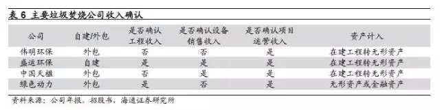 通常而言,對于垃圾焚燒BOT項目,如果公司自建,則會確認工程收入,如果將項目外包,則不確認工程收入。四家公司中,盛運環(huán)保項目主要為自建,并且確認工程收入,而偉明環(huán)保和中國天楹主要采取外包的方式,不確認工程收入。綠色動力有所不同,公司將項目發(fā)包給其他方,但考慮到其對項目負有整體履約責任并承擔所有費用和風險,在項目建造階段確認相應(yīng)的建造收入,該等建造收入根據(jù)獨立評估師評定的公允價值計量。此外,盛運環(huán)保和中國天楹確認設(shè)備銷售收入,偉明環(huán)保與綠色動力則不確認,四家公司都確認項目運營收入。