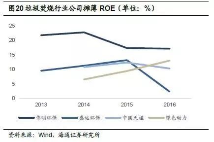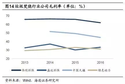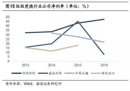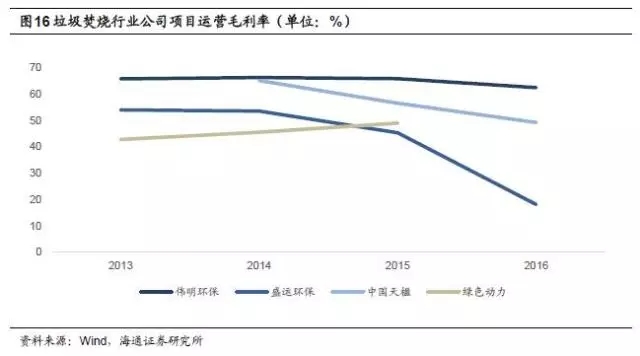 偉明環(huán)保項目運營毛利率較高,2015年為65.9%,2016年小幅下降,為62.5%;中國天楹運營業(yè)務(wù)毛利率也相對較高,2016年為49.2%,但相較于2014年的65.1%下滑近16個百分點;綠色動力2015年毛利率為49.0%;盛運環(huán)保2015年運營業(yè)務(wù)毛利率為45.3%,2016年為18.0%。