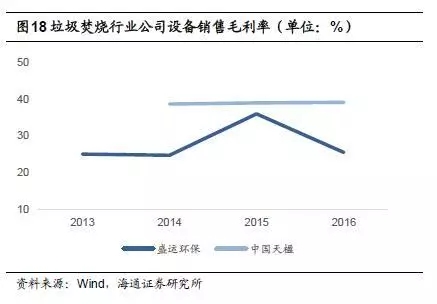 盛運環(huán)保和中國天楹兩家公司確認設(shè)備銷售毛利率,中國天楹設(shè)備毛利率較為穩(wěn)定,近三年維持在38%-39%之間,盛運環(huán)保設(shè)備銷售毛利率略低,2015年為36.0%,2016年為25.5%。