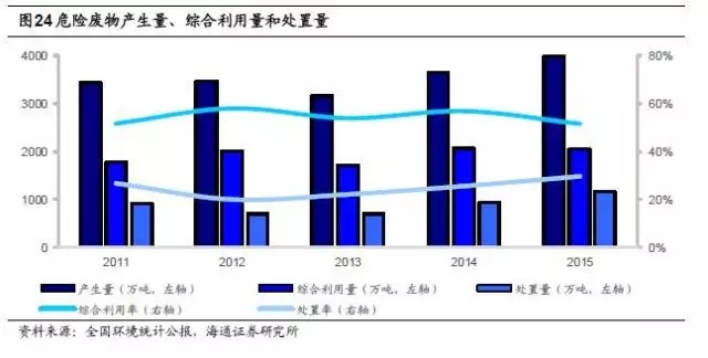 根據(jù)環(huán)境統(tǒng)計年報數(shù)據(jù),2015年全國工業(yè)危險廢物產(chǎn)生量為3976萬噸,占一般工業(yè)固體廢物產(chǎn)生量的1.22%,過去十年年均復(fù)合增長率約為12%;綜合利用量為2050萬噸,綜合利用率52%;處置量1174萬噸,處置率30%;貯存量810.3萬噸(含前期);危廢綜合利用處置率約為82%。根據(jù)2008年環(huán)保部公布的危廢處置名單,當時全國1500多家具有危廢處理資質(zhì)的企業(yè)中,處理能力達到1000噸/日的企業(yè)僅占0.3%,目前行業(yè)格局沒有太大變化。