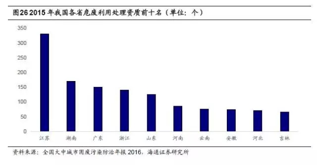 我國危廢綜合利用與處置行業(yè)格局分散,市場集中度較低。2015年全國危廢許可證(含醫(yī)療危廢)數(shù)量為2034個,較前一年增加113個,其中江蘇省頒發(fā)的危廢許可證數(shù)量為327個,數(shù)量上排名第一,湖南、廣東分列二、三位,數(shù)量在150個左右,浙江、山東也超過100個。截止到2015年,全國危險廢物經(jīng)營單位核準經(jīng)營規(guī)模達到5263萬噸/年,其中核準利用規(guī)模為4155.1萬噸/年,核準處置規(guī)模為982.4萬噸/年,平均每個許可證僅對應(yīng)2.59萬噸/年的利用和處置能力。根據(jù)2008年環(huán)保部公布的危廢處置名單,當時全國1500多家具有危廢處理資質(zhì)的企業(yè)中,處理能力達到1000噸/日的企業(yè)僅占0.3%,目前行業(yè)格局沒有太大變化。