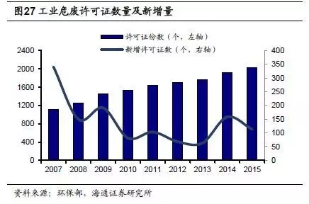 我國政府對危廢處理行業(yè)實行許可證制度。這一方面能夠保證從事危廢處理業(yè)務(wù)的公司基本擁有較強的技術(shù)實力和項目經(jīng)驗,從而保障危廢無害化處理的效率,減少處理不當造成的二次污染;另一方面,實行許可證制度會限制新進企業(yè)數(shù)量,限制全國危廢綜合利用和處置總量。