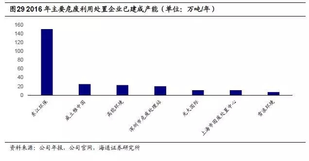 東江環(huán)保龍頭地位顯著。截止2016年底,東江環(huán)保已擁有國家危險廢物名錄中46大類中的44類危廢經(jīng)營資質(zhì),僅次于威立雅中國,公司危廢利用和處置資質(zhì)近150萬噸/年(其中無害化處置資質(zhì)達到72萬噸/年),遠遠高于威立雅中國,另根據(jù)公司規(guī)劃,預(yù)計到2020年總產(chǎn)能將達到350萬噸(其中無害化產(chǎn)能達到200萬噸),增長空間可觀。