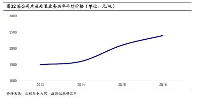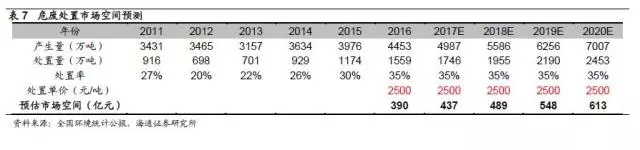 危廢處置價格穩(wěn)步上升,市場空間巨大。從核準經(jīng)營規(guī)???,危廢處置產(chǎn)能緊缺,2015年核準處置規(guī)模僅982.4萬噸/年。近年來,危廢處置價格呈現(xiàn)穩(wěn)步上升趨勢。以行業(yè)內(nèi)某領(lǐng)先企業(yè)為例,2013年,其危廢處置業(yè)務(wù)平均價格為1500元/噸左右,2016年則上升至2500元/噸左右。以全國環(huán)境統(tǒng)計公報數(shù)據(jù)為基礎(chǔ),假設(shè)未來幾年危廢產(chǎn)生量保持過去十年復(fù)合增長率12%的增速,保守估計處置率為35%,單位處置成本為2500元/噸,則預(yù)計2020年危廢處置市場為613億元,2017-2020處置市場空間總計2086億元??紤]到還有大量的危廢沒有進入國家統(tǒng)計口徑,若將這些量考慮在內(nèi),市場空間還將提升2-3倍。