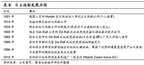 公司前身大阪安治川岸創(chuàng)立大阪鐵工所于 1881 年由一名叫 E.H.Hunter 的英國 人創(chuàng)立,之后公司經(jīng)歷了改組,于 1934 年成立了日立造船。公司以制造業(yè)為 主,最初從事船舶、橋梁等海陸區(qū)域的制造服務。1960 年,日立造船與瑞士 Von Roll 公司開始垃圾焚燒技術合作,開啟了日立造船在垃圾焚燒領域的發(fā)展。 它是日本建設國內第一座垃圾焚燒發(fā)電設施的龍頭公司,與 Von Roll 一起向全 球范圍內提供垃圾焚燒發(fā)電設施。