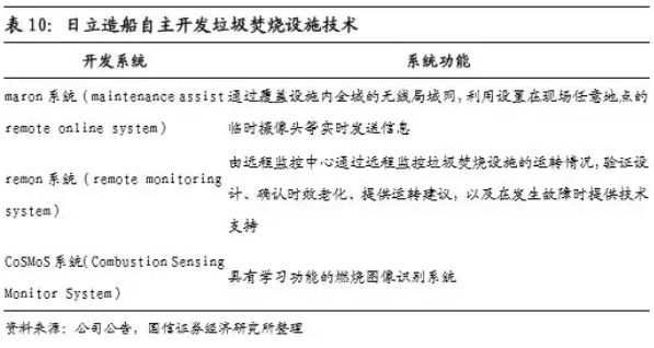 堅持研發(fā)更新,引領世界最先進垃圾焚燒設施技術。日立造船在垃圾焚燒發(fā)電 領域堅持自主研發(fā),不斷更新垃圾焚燒技術。2014-2017 年間研發(fā)費用也逐漸 上升,2017 年研發(fā)費用高達 70 億日元。從營業(yè)收入占比來看,日立造船近 4 年均維持 2%的水平。日立造船在垃圾焚燒領域的核心王牌,是自主開發(fā)的影像 認證系統(tǒng)和積累的大量焚燒爐運行數(shù)據(jù)。早在 2001 年和 2011 年,公司就已經(jīng) 研發(fā)出maron系統(tǒng)和remon系統(tǒng),主要用于遠程監(jiān)控和實時共享圖像視頻信息, 為垃圾焚燒設施的正常運行提供保證。2013 年底,公司宣布開發(fā)出 CoSMoS 系統(tǒng),即具有學習功能的燃燒圖像識別系統(tǒng)。影像識別技術能夠精確識別、判 斷焚燒爐內火焰和垃圾的狀態(tài),并結合以往的計量數(shù)據(jù)來判斷和選擇焚燒爐最 適宜的燃燒方式,使各個焚燒設施實現(xiàn)了運行作業(yè)可視化、自動化,節(jié)省大量 人力成本、提升垃圾焚燒設施運轉效率。2015 年,公司運用 SPring-8 控制架 構"MADOCA II" 開發(fā)垃圾焚燒發(fā)電成套設備的大數(shù)據(jù)管理系統(tǒng),使公司的大數(shù) 據(jù)管理能力得到進一步提高。2017 年,公司為針對垃圾焚燒發(fā)電設施實行遠程 監(jiān)控,在總部建設了一座遠程監(jiān)控暨運營支持中心,以物聯(lián)網(wǎng)、大數(shù)據(jù)分析為基礎,強化垃圾焚燒發(fā)電設施的遠程監(jiān)控和運營支持能力,加強尖端信息技術的運用。