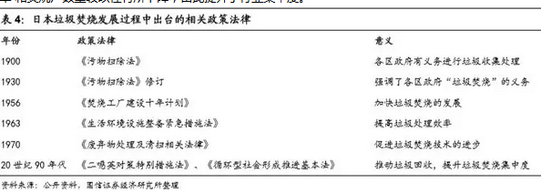 日本作為發(fā)達國家,受到國土面積小的限制,垃圾處理僅靠填埋無法滿足其日益增 長的垃圾產(chǎn)生量,因此日本成為了世界上最早使用焚燒技術進行垃圾處理的國家。日本垃圾焚燒發(fā)展已經(jīng)超過了 100 年,它的發(fā)展過程極具代表性,主要可以分為 三個階段:啟蒙階段、快速發(fā)展階段和行業(yè)集中階段。