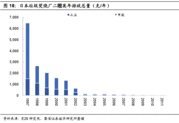 日本政府后來采取的措施,是規(guī)定焚燒廠必須維持在 850-1100 攝氏度內分解廢 棄物,焚燒爐內煙氣在焚燒爐內停留超過 2 秒鐘,并持續(xù)噴射活性炭等吸附劑, 然后使用布袋除塵器來捕集細微顆粒,從而最大限度減少二噁英的生成與排放。 日本法律規(guī)定的排放標準中,根據(jù)焚燒爐規(guī)模大小設置不同的標準量。總體來 看,最高不得超過 0.1ng-TEQ/M3N,高標準高要求使得日本的二噁英排放量急 劇下降,到 2011 年時,日本的垃圾焚燒廠排放二噁英毒性當量總量僅為 59 克, 其中生活垃圾焚燒廠排放 32 克,工業(yè)廢物焚燒廠排放 27 克,較 1997 年降低 了 99%。目前,日本垃圾焚燒廠排放物已經(jīng)接近空氣,二噁英的含量趨近于 0。