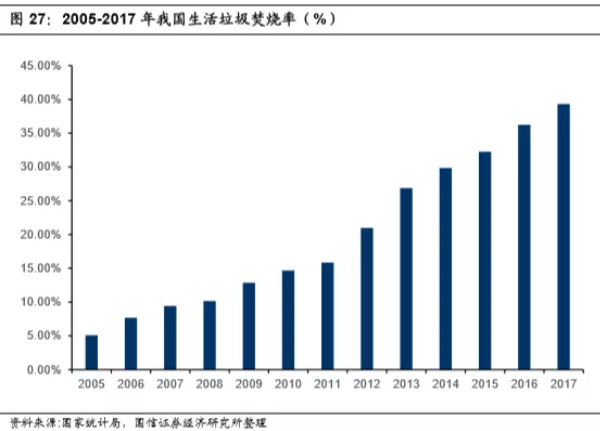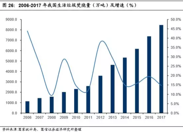 垃圾焚燒率目前不到 40%。從 2006 年到 2017 年生活垃圾清運量和生活垃圾 焚燒量的數(shù)據(jù)來看,2017 年全國生活垃圾清運量為 2.15 億噸,生活垃圾焚燒 量為 8463 萬噸,生活垃圾焚燒率為 39.33%。盡管焚燒率逐年提高,但總體仍 較低水平。