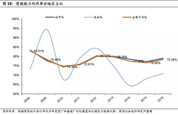 農村地區(qū)垃圾處理仍處于初級階段。根據(jù)住建部發(fā)布的《城鄉(xiāng)建設統(tǒng)計年鑒》,農 村地區(qū)現(xiàn)每年產(chǎn)生垃圾總量穩(wěn)定在 6600 萬噸以上,人均垃圾產(chǎn)生量穩(wěn)定處于 0.3 千克/天的水平。2016 年農村人口占總人口的43%,農村的人均垃圾產(chǎn)生量和垃圾 清運比例有巨大的提升空間,所以考慮經(jīng)濟發(fā)展和農村垃圾清運比例的提升,我國 的垃圾焚燒市場未來空間仍然十分廣闊。