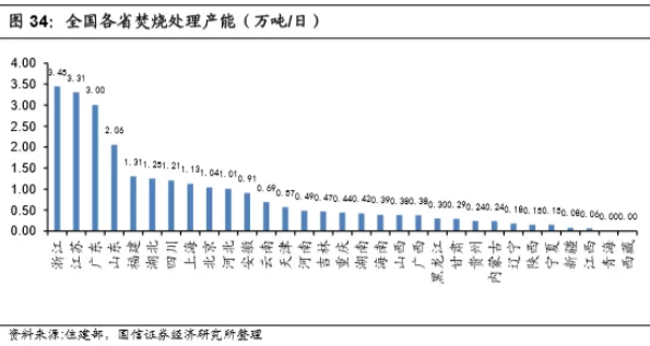 從垃圾焚燒產(chǎn)能分部來看,浙江、江蘇、廣東三省垃圾焚燒產(chǎn)能超過 3 萬噸/日, 甘肅、貴州、內蒙古、遼寧、陜西、寧夏、新疆、江西 8 省垃圾焚燒產(chǎn)能不足 3000 噸/日,而青海和西藏更是尚無垃圾焚燒項目。
