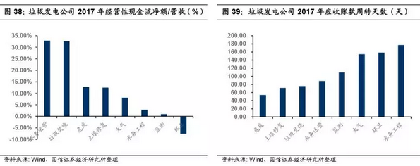 垃圾焚燒發(fā)電行業(yè)的項目屬于運營類資產(chǎn),項目投運之后每年可以獲得穩(wěn)定的垃圾 處置收入和電費收入,因此現(xiàn)金流情況良好。與環(huán)保其它板塊相比,垃圾焚燒發(fā)電 行業(yè) 2018 年經(jīng)營性現(xiàn)金流/營業(yè)收入比例為 32.57%,在環(huán)保所有子行業(yè)中位列第二,僅次于水務運營行業(yè)。從應收賬款周轉天數(shù)來看,垃圾焚燒發(fā)電行業(yè) 2017 年周轉天數(shù)為 76 天,在環(huán)保所有子行業(yè)中排名第三,僅次于危廢和土壤修復行業(yè),應收賬款周轉較快。