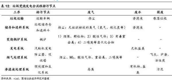 垃圾焚燒發(fā)電流程主要分為垃圾前端收集處理、垃圾發(fā)電以及末端煙氣、爐渣、 飛灰處理等。在項目運行過程中,會產(chǎn)生煙氣、滲濾液、飛灰、爐渣等污染物。 為減少生活垃圾焚燒造成的二次污染,環(huán)保部公布推出了《生活垃圾焚燒污染控制標準(GB18485-2001)》,替代國家環(huán)境保護總局發(fā)布的《上火垃圾焚燒污染控制標準(GWKB3-2000)》,并于 2014 年進行了修訂。