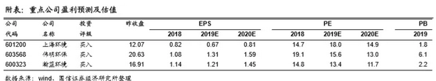 ③ 上海環(huán)境未來看點主要在于:1)水務和危廢資產(chǎn)注入;2)垃圾焚燒發(fā)電2020 年將迎來項目投運高峰期,垃圾焚燒業(yè)務有望明顯放量;3)污水業(yè)務提標改 造帶來的增量空間;4)可能的外延收購及新興領域的市場拓展。預計公司 2019-2021 年實現(xiàn)歸母凈利潤 5.83/7.08/8.13 億,對應 PE19/16/14 倍,給予 “買入”評級。