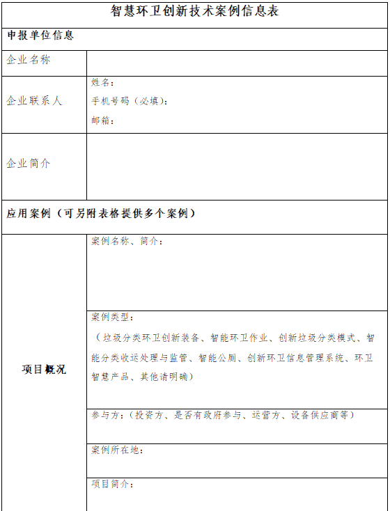 智慧環(huán)衛(wèi)是智慧城市的一個(gè)重要組成部分,智慧城市的建設(shè)迫切需要智慧環(huán)衛(wèi)的提升。在此背景下,中國(guó)環(huán)聯(lián)擬面向行業(yè)征集“智慧環(huán)衛(wèi)創(chuàng)新技術(shù)案例”,征集范圍包括垃圾分類環(huán)衛(wèi)創(chuàng)新裝備、智能環(huán)衛(wèi)作業(yè)、創(chuàng)新垃圾分類模式、智能分類收運(yùn)處理與監(jiān)管、智能公廁、創(chuàng)新環(huán)衛(wèi)信息管理系統(tǒng)、環(huán)衛(wèi)智慧產(chǎn)品等的環(huán)衛(wèi)相關(guān)落地應(yīng)用項(xiàng)目案例。請(qǐng)有意向的企業(yè)按附件填寫申報(bào)表,并發(fā)郵件至以下郵箱地址。