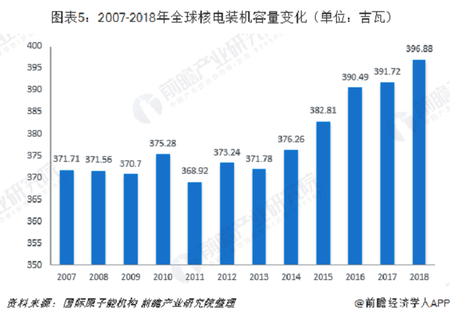 2016年底,世界能源理事會(huì)(WEC)發(fā)布第24版《世界能源報(bào)告》,報(bào)告提到包括中國、韓國、印度、俄羅斯、美國等國家均有多臺(tái)核電機(jī)組在建,許多國家政府依然將核電視為能源結(jié)構(gòu)的重要組成部分。2018年2月,臺(tái)灣當(dāng)局指示臺(tái)灣電力公司開展臺(tái)灣第二核能發(fā)電站2號(hào)機(jī)組的重啟工作。2018年11月,日本四國電力公司伊方核電站3號(hào)機(jī)組重啟,是日本經(jīng)歷福島核事故后重啟的第10臺(tái)核電機(jī)組,核電行業(yè)在正在逐漸回溫。根據(jù)國際原子能機(jī)構(gòu)的統(tǒng)計(jì),2007年至2018年,全球核電裝機(jī)容量總體呈上升趨勢。2018年,全球核電在運(yùn)裝機(jī)容量為396.88吉瓦。