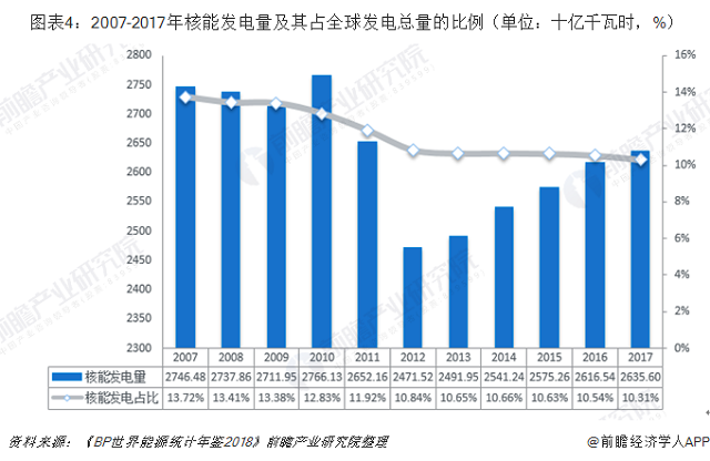 根據(jù)BP的統(tǒng)計(jì),2017年全球總發(fā)電量為255513億千瓦時(shí)。2007年至2010年,全球核能發(fā)電量總體保持平穩(wěn),2011年至2012年,受福島核事故影響,全球核能發(fā)電量顯著下跌,此后于2013年開始,全球核能發(fā)電量逐漸恢復(fù)。根據(jù)國際原子能機(jī)構(gòu)的數(shù)據(jù)顯示,2017年,核能發(fā)電量為26356億千瓦時(shí),占全球總發(fā)電量的10.31%。