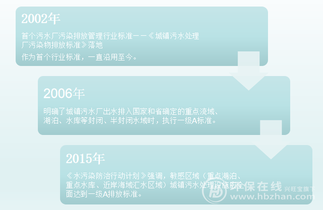 在地表水環(huán)境質(zhì)量標(biāo)準(zhǔn)中,對地表Ⅳ類有24類指標(biāo),對污水處理廠出水最重要的是COD、BOD、氨氮、總氮和總磷五項(xiàng)指標(biāo)。尤其是《城鎮(zhèn)污水處理廠污染物排放標(biāo)準(zhǔn)》,帶動(dòng)我國污水處理廠從二級常規(guī)生物處理發(fā)展為具有脫氮除磷功能的二級強(qiáng)化處理工藝。下圖所列為近年來污水處理廠排放標(biāo)準(zhǔn)變革過程: