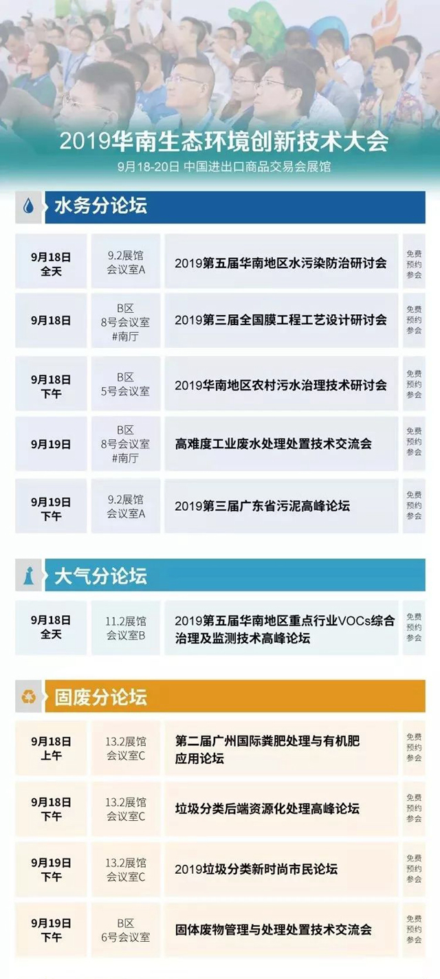 本屆展會(huì)擴(kuò)大到4個(gè)展館,集中展示創(chuàng)新的水與污水處理、給水排水、固廢處理、大氣治理、場(chǎng)地修復(fù)、環(huán)境監(jiān)測(cè)等技術(shù)設(shè)備,同期舉辦“2019華南生態(tài)環(huán)境創(chuàng)新技術(shù)大會(huì)”,下設(shè)數(shù)20場(chǎng)豐富且聚焦行業(yè)熱點(diǎn)的專(zhuān)業(yè)論壇與活動(dòng),與產(chǎn)業(yè)鏈各端精英一同把握行業(yè)動(dòng)向,探討創(chuàng)新解決方案。