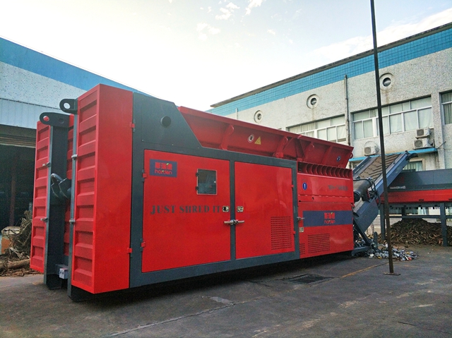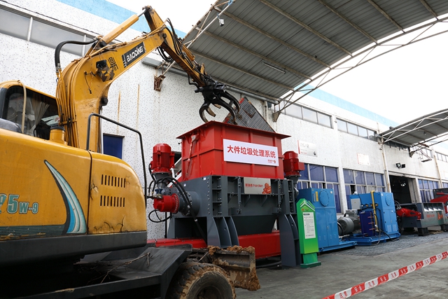 斯瑞德大件生活垃處理設備“吃進”鋼絲床墊、冰箱、油漆桶、自行車,裝著刀片的滾軸,將這些物料切分、撕碎,直至從出料口出來的是不足20厘米的碎料。