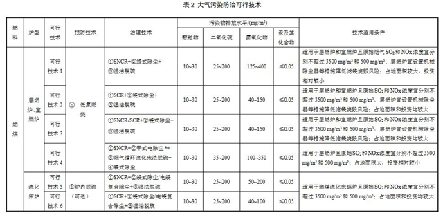 鍋爐排污單位選擇污染防治可行技術時宜綜合考慮許可排放限值、燃料性質(zhì)、爐型,及實際應用情況等。具體的大氣污染防治可行技術參見表2。
