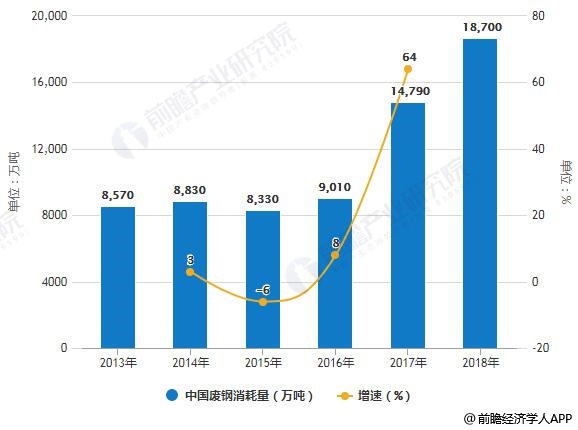 2013-2018年中國廢鋼消耗量統(tǒng)計及增長情況