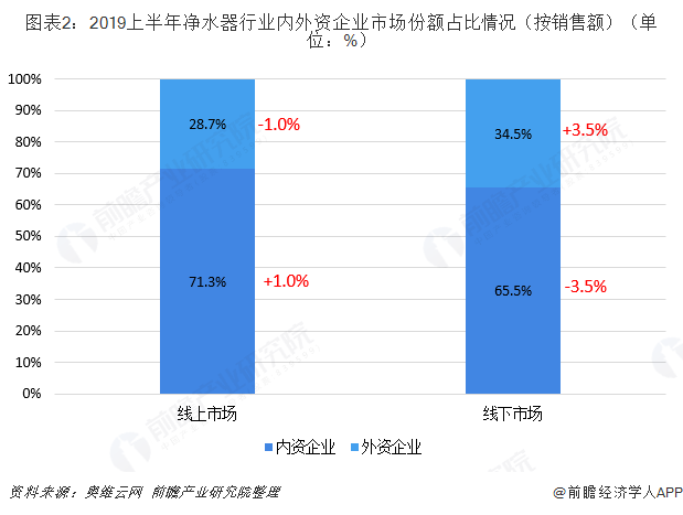 2019年上半年中國凈水器線下市場與2018年上半年相比新進入行業(yè)品牌20個,退出行業(yè)品牌20個,凈水器線下市場整體品牌數(shù)量保持不變,共計105個。從銷售額的角度來看,內(nèi)資企業(yè)占據(jù)大部分市場份額,占比達到65.5%,同比下降3.5個百分點;外資企業(yè)占比達到34.5%,同比增長3.5個百分點。