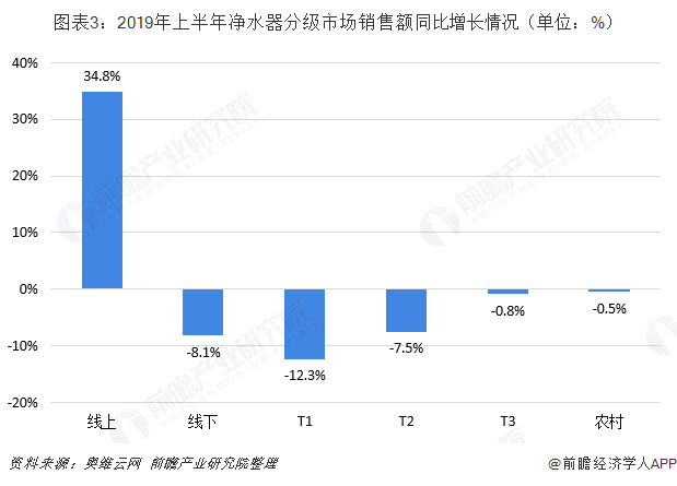 2019年上半年,凈水器線上線下市場分化明顯,線上市場繼續(xù)快速增長,線下市場開始萎縮。2019年上半年,一二級市場成為主要萎縮市場,三級市場及農(nóng)村市場微降,渠道下稱對于線下市場的拉動效應(yīng)不明顯。