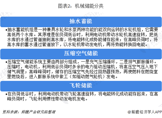 根據(jù)不同的儲電技術(shù),主要分為機(jī)械儲能、電化學(xué)儲能和電磁儲能。而機(jī)械儲能主要包括抽水儲能、壓縮空氣儲能和飛輪儲能,其技術(shù)特點都是以水、空氣等作為儲能介質(zhì),這些儲能介質(zhì)不發(fā)生化學(xué)改變。