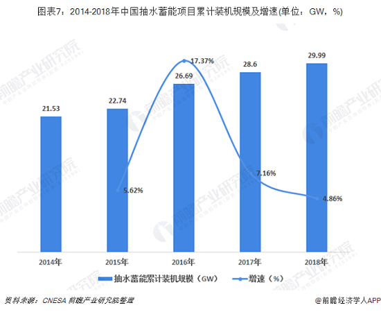 2014-2018年我國抽水蓄能市場規(guī)模不斷擴(kuò)大。根據(jù)CNESA全球儲能項目庫的不完全統(tǒng)計,截至2018年底,中國已投運(yùn)儲能項目累計裝機(jī)規(guī)模31.3GW,其中抽水蓄能的累計裝機(jī)規(guī)模最大,為29.99GW,同比增長4.86%,占全國儲能裝機(jī)總規(guī)模的96%。