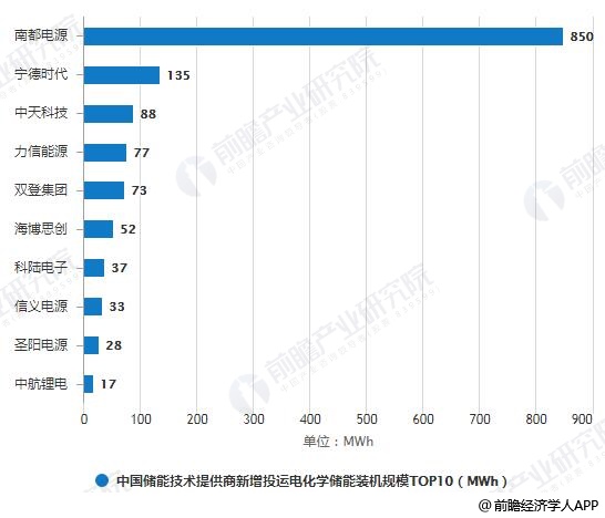 2018年,中國(guó)新增投運(yùn)的電化學(xué)儲(chǔ)能項(xiàng)目中,裝機(jī)規(guī)模排名前十位的儲(chǔ)能技術(shù)提供商,依次為:南都電源,寧德時(shí)代、中天科技、力信能源、雙登集團(tuán),海博思創(chuàng)、科陸電子、信義電源、圣陽電源和中航鋰電。