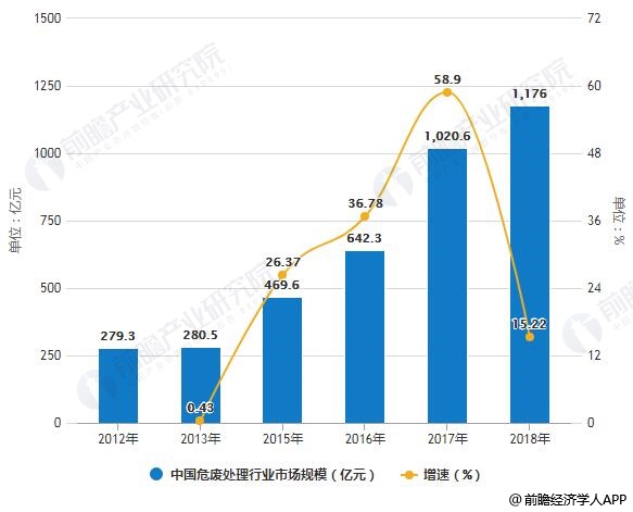 2012-2018年中國(guó)危廢處理行業(yè)市場(chǎng)規(guī)模統(tǒng)計(jì)及增長(zhǎng)情況